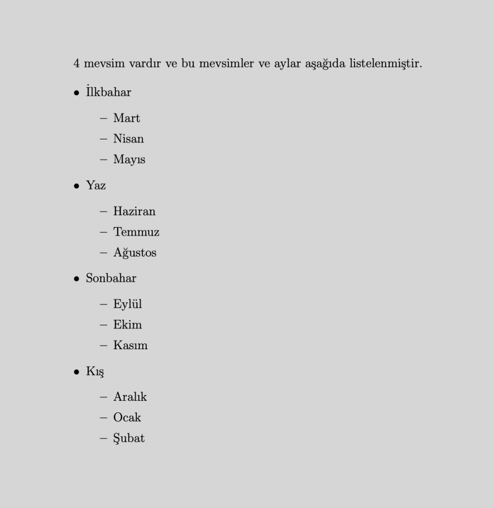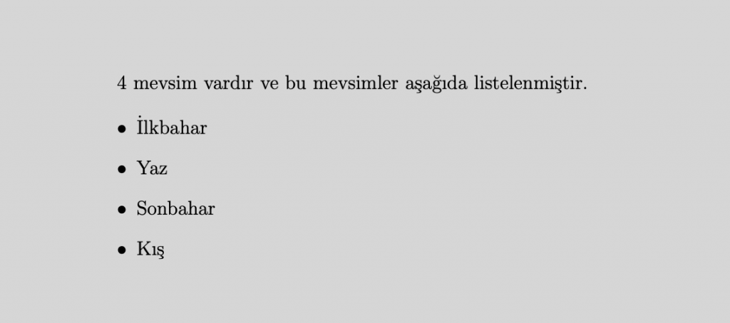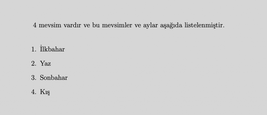 etiketi olacaktır. Sadece mevsimlerin olduğu örneği numaralı olarak yazacak olursak enumerate paketini kullanmamız gerekir ve kodlarımız aşağıdaki şekline dönüşecektir.